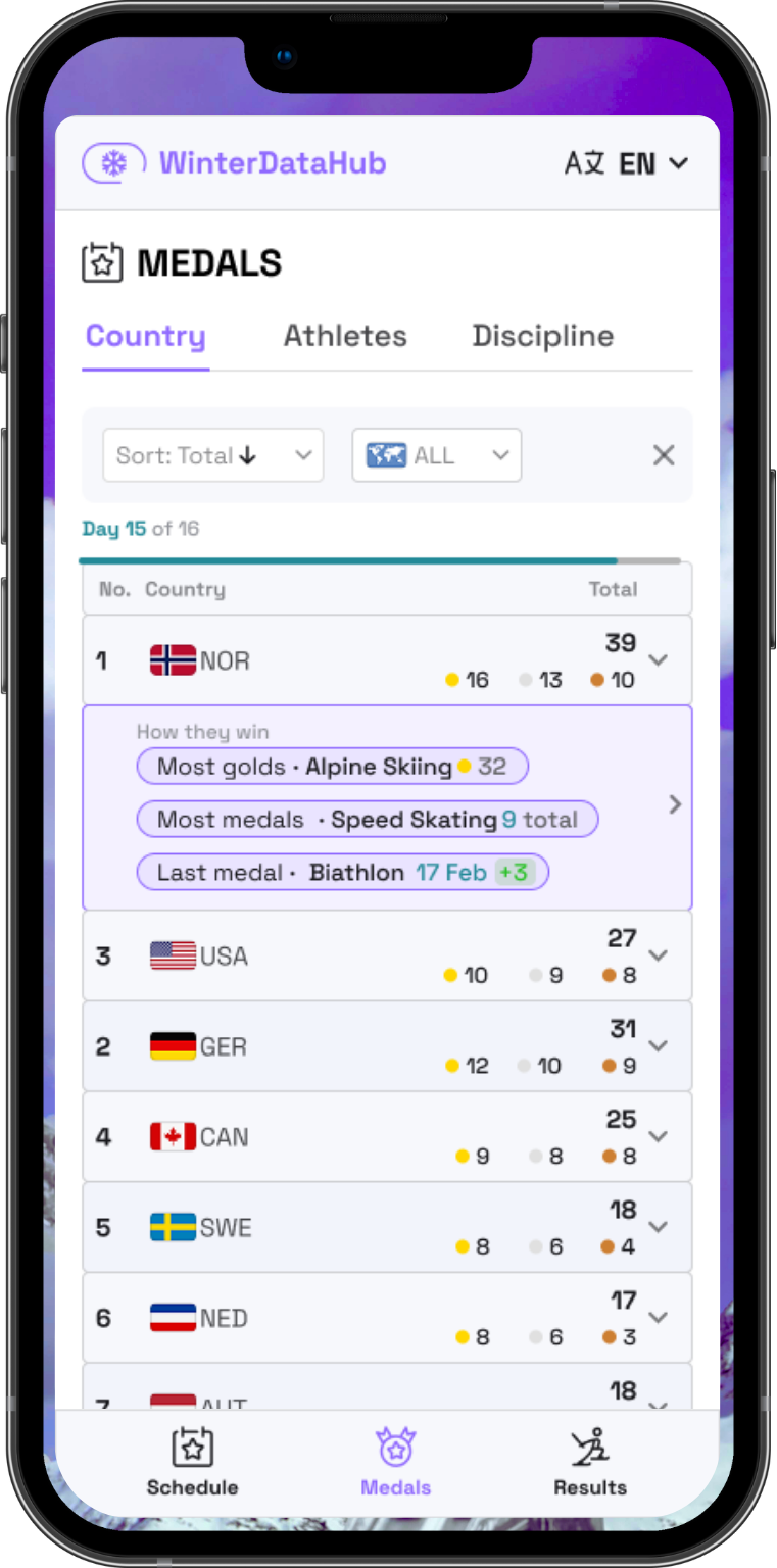 From live updates to final results, the Winter Data Hub 2026 brings every discipline to your fingertips